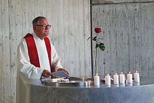 Gemeinsam sprachen die Gottesdienstbesucher nach der Predigt das Credo von Dietrich Bonhoeffer. Anstelle der Fürbitten beteten die drei Seelsorger und Pater Rohring CMM sowie Adriana Insel und Matthias Dörr das Gebet um Frieden von Jaroslav Šimsa. Šimsa hat dieses 1941 als Häftling verfasst. „Das Gebet und die Bitten von Jaroslav Šimsa führen uns die Sorgen und Nöte der Zeit des Krieges, der Verfolgung und des Leides vor Augen. Doch mit dem Krieg waren die Sorgen, die Nöte, das Leid nicht vorbei. Viele Menschen – vor allem auch aus dem Sudetenland – mussten ihren Besitz, ihre Gewohnheiten, ihre Heimat zurücklassen. Auf beschwerlichen, bedrohlichen Wegen sind sie nach Deutschland gekommen, haben geliebte Menschen und alle Sicherheiten verloren“, ergänzte Pfarrerin Mühlbacher. Sie rief zum Abschluss vor dem gemeinsamen „Vater unser“ zu einem Moment des Gebets in Stille für Verständigung und Versöhnung auf.